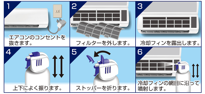 エアコン内部クリーナーシュ!シュ! エアコンの内部を安全簡単に洗浄! 気になるエアコンの内部をきれいにするクリーナー 超電水から生まれたエアコン内部のアルミフィン専用クリーナー。 成分は超電水とアルミを保護するケイ酸塩のみ。だから安心して使えます。 超電水の除菌洗浄パワーとジェットノズルでアルミフィンの細部や奥まで汚れを落とすことで、洗浄・除菌・消臭が一度にできます。 使い方はとっても簡単。 エアコンの前面カバーを開け、フィルターを取り外し、露出したフィンの網目に沿ってスプレーするだけ! (よく振ってから使用してください) スプレーされた洗浄液は外のドレンホースから流れ出るので、お部屋を汚しません。 自動お掃除機能付きエアコンにも使用することができます。 (センサー部分や配線部分には洗浄液をかけないように注意してご使用ください。) ※使用できるエアコン 壁に取り付けるタイプのルームエアコンで、前面パネルを開けることができ、かつドレーンホース(排水ホース)がついている機種にお使い頂けます。 (前面パネルを開けても熱交換器部分が露出しないタイプの機種は使えません) ※使用できないエアコン ドレーンホース(排水ホース)がついていないエアコンは使用できません。 他にも前面パネルを開けても熱交換器部分が露出しないタイプの機種や、天井埋め込みタイプ、天井吊り下げタイプ、床置きタイプ、窓取りつけタイプ、カバーの開けられないエアコン、カーエアコン、室外機は使用できません。 エアコンの電装部(センサーや電子基板、スイッチ、モーター等)には、洗浄液がかからないように注意してご使用ください。 誤った方法で使用されると故障の原因になる場合があります。 使い方 エアコン内部クリーナーシュ!シュ! 420ml/税込1,320円