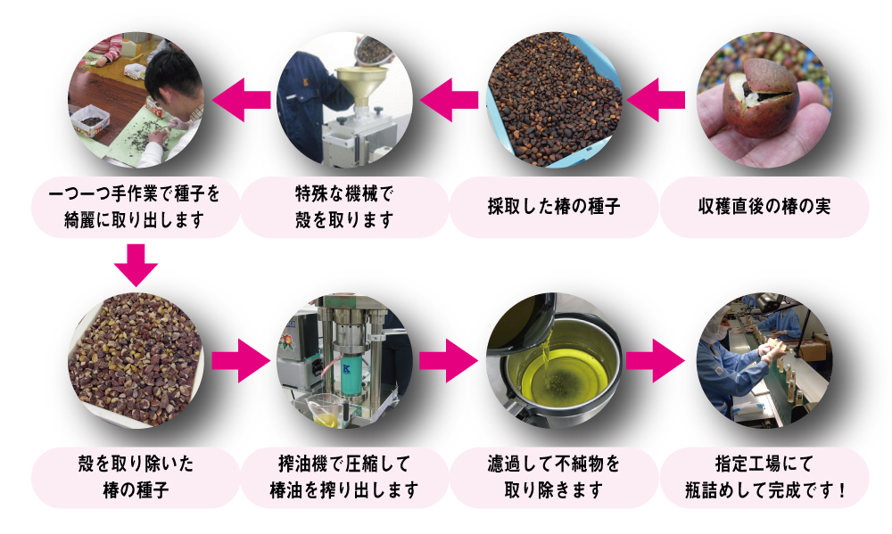 自然に囲まれた山口県萩市は日本でも有数の 椿群生林(約10haの敷地に25000本)を有し、 市の花としても椿が登録されています。 萩市の大自然が育んだ椿の実。 毎年、限られた数しか獲れないその椿の種子を ひとつひとつ手作業で選別し、 熱を加えずに生のまま搾りました。 サラサラと肌に馴染む非加熱の 生絞り椿オイルを是非ご実感ください。