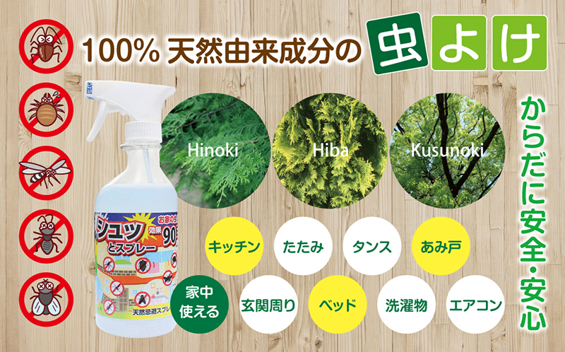 ヒバ、ヒノキ、クスノキ、ヤシ、除虫菊などの植物から抽出した天然由来成分100%なので、体に安全。