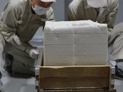 一昼夜かけて枠で冷やし固めた石けんを人の手で切り分ける。松山油脂が続けている石けんのつくり方、枠練り製法です。