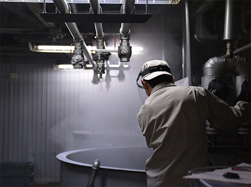 松山樹脂では昔ながらの釜焚き製法で石けんをつくっています。鹸化・塩析・静置・仕上げ塩析という工程を踏み、仕上がりまでに百時間かけています。