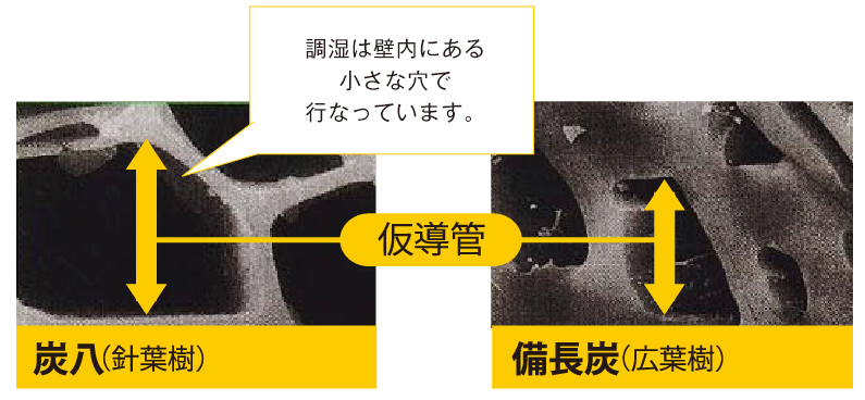 炭八の原材料は針葉樹の木材です。地面から水を吸い上げる「仮道管」が広葉樹より太いため、焼き上げて木炭となった後も隙間が多く、湿気を取り込む孔が広いのです。
