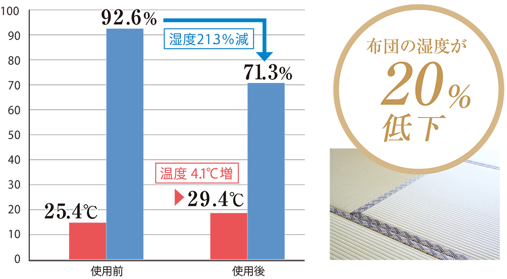 敷布団の下に炭八を設置する前後の敷布団の温度・湿度の比較
