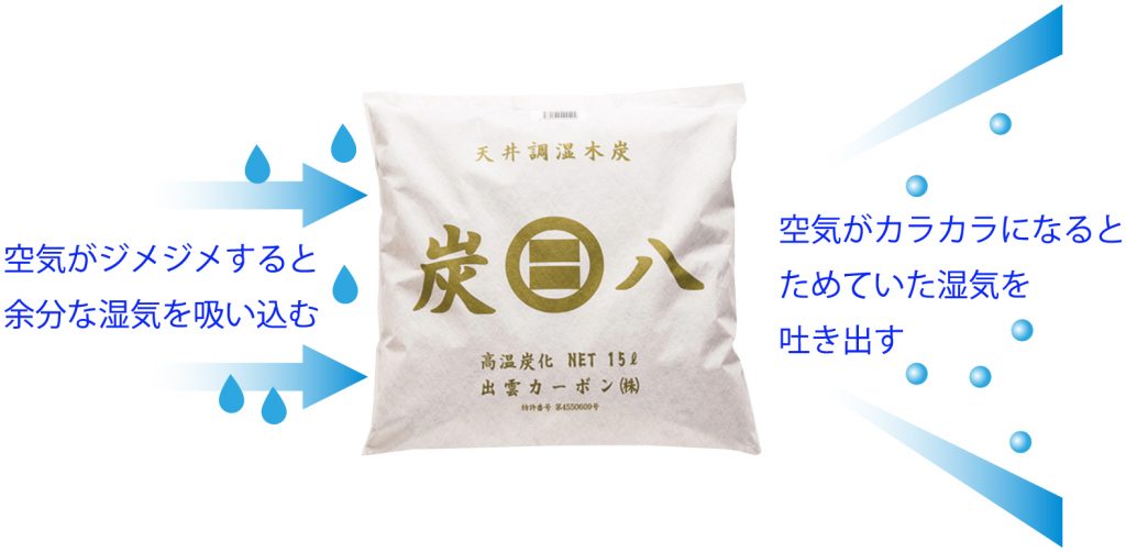 だから、炭八は他の木炭よりも短時間で吸湿でき、空気が乾燥している時には素早く放湿も可能です。
