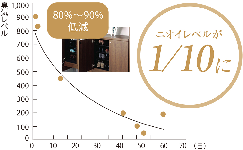 下駄箱に炭八を入れた後の臭気レベルの変化