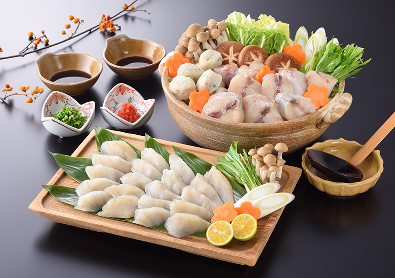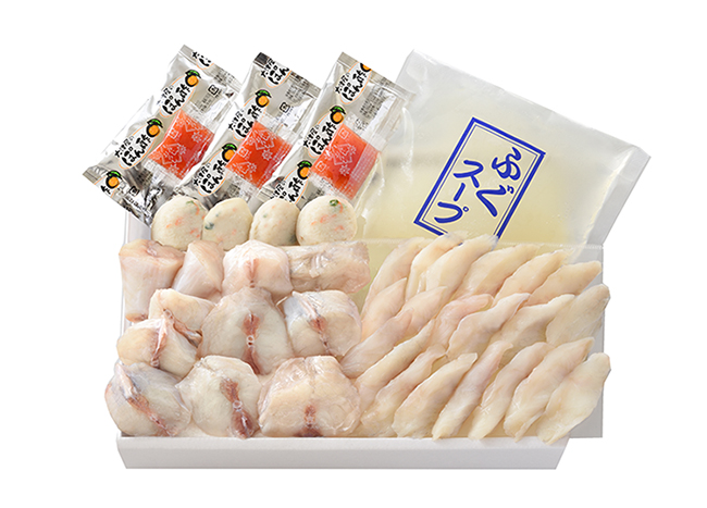 真ふく切り身300g×1、真ふくスライス100g×1、ふく入りつみれ×4個、ふぐスープ500g×1、ぽん酢30ml×3、もみじおろし5g×3