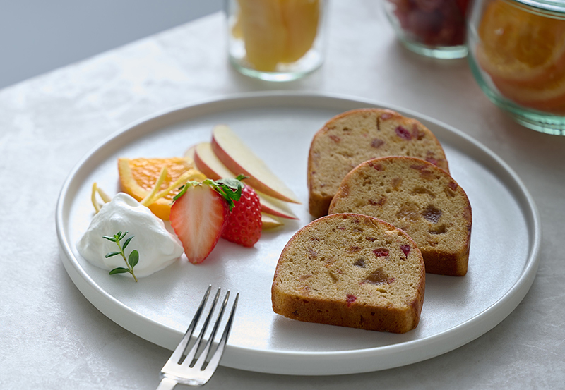 7種類のフルーツを洋酒に漬け込み、紅茶の生地でくるんだ、フルーツが詰まったパウンドケーキ。ひとくち食べ進めていくごとに、7種のフルーツそれぞれの味わいを楽しめる、ホテルシェフならではのデザートに仕上げました。