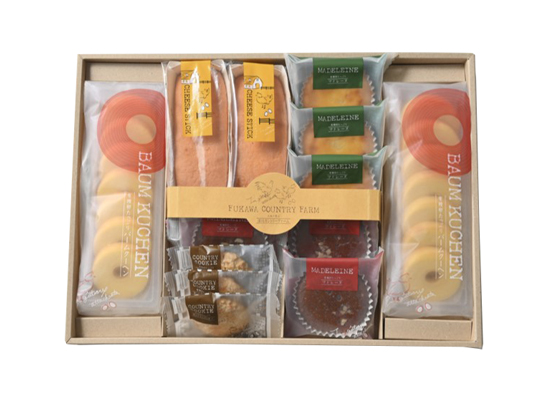 しっとりバームクーヘン×12個、焦がしキャラメルがしみ込んだバーム×8個、有精卵たっぷりマドレーヌ(プレーン・ショコラ×各6個)