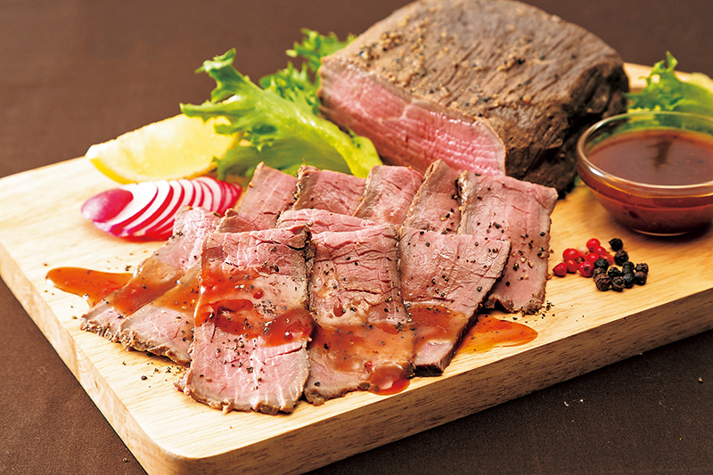 数種類のスパイスで下味をつけたもも肉を真空加熱でじっくり焼きあげた、中がしっとりとしたローストビーフ。シェフこだわりのガーリックペッパーソースがお肉の旨みをさらに味わい深く演出します。