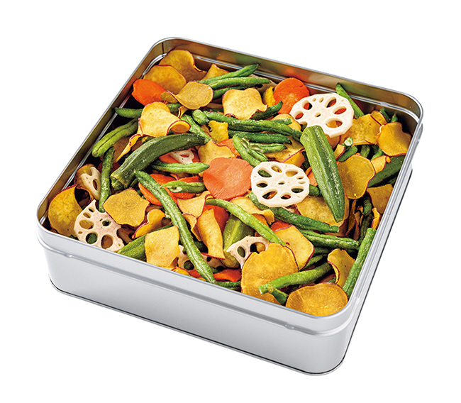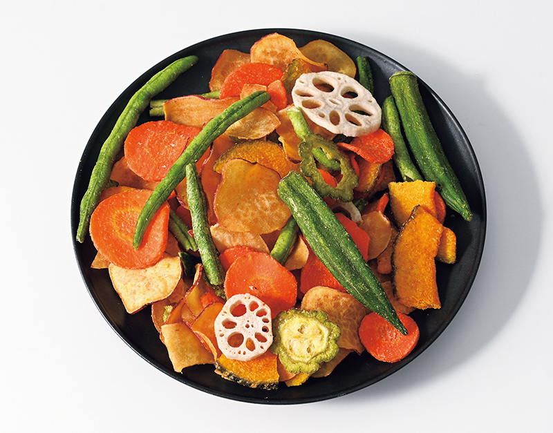 野菜を減圧フライ製法でフライしました(一部常圧フライ)。素材そのままの野菜の味をお楽しみください。全部で7種類入っており、そのまま食べても、トッピングにもおすすめです。