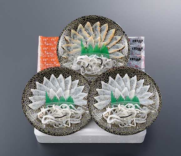 真ふぐ霜降り刺身20g×2、真ふぐたたき刺身20g、とらふぐ皮20g×3、